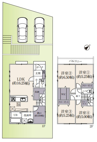 | 間取詳細 | (1階)LDK16.25、(1階)納戸3.0、(2階)洋6.5、(2階)洋5.25、(2階)洋5.25、(2階)洋5.0 |