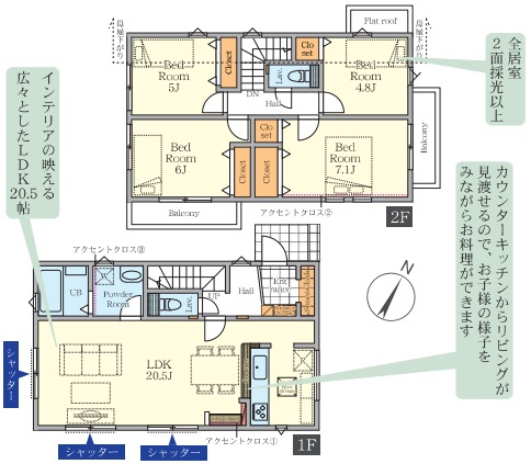 | 間取詳細 | (1階)LDK20.5、(2階)洋7.1、(2階)洋6.0、(2階)洋5.0、(2階)洋4.8 |