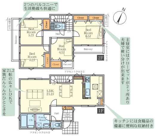 | 間取詳細 | (1階)LDK21.2、(2階)洋6.5、(2階)洋5.2、(2階)洋5.2、(2階)洋4.5 |