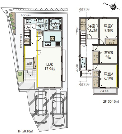 | 間取詳細 | (1階)LDK17.9、(2階)洋6.1、(2階)洋5.3、(2階)洋5.0、(2階)洋3.2 |