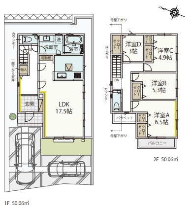 | 間取詳細 | (1階)LDK17.5、(2階)洋6.5、(2階)洋5.3、(2階)洋4.9、(2階)洋3.0 |