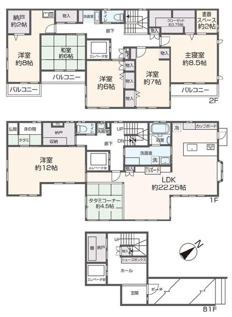 | 間取詳細 | (1階)LDK22.25、(1階)洋12.0、(1階)和4.5、(2階)和6.0、(2階)洋8.5、(2階)洋8.0、(2階)洋6.0、(2階)洋6.0、(2階)書斎2.0 |