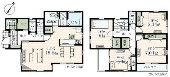 | 間取詳細 | (1階)LDK18.5、(2階)洋7.01、(2階)洋6.0、(2階)洋5.34、(2階)洋4.59 |