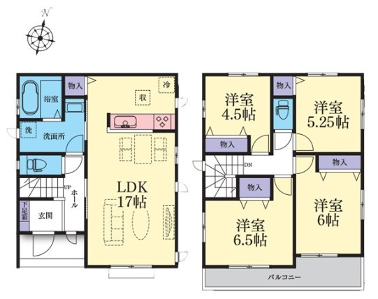 | 間取詳細 | (1階)LDK17.0、(2階)洋6.5、(2階)洋6.0、(2階)洋5.25、(2階)洋4.5 |