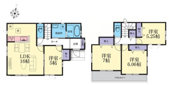 | 間取詳細 | (1階)LDK16.0、(1階)洋5.0、(2階)洋7.0、(2階)洋6.06、(2階)洋5.25 |