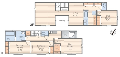 (1階)洋7.0、(1階)S5.3、(1階)S5.1、(2階)LDK22.9、(2階)洋5.3  |