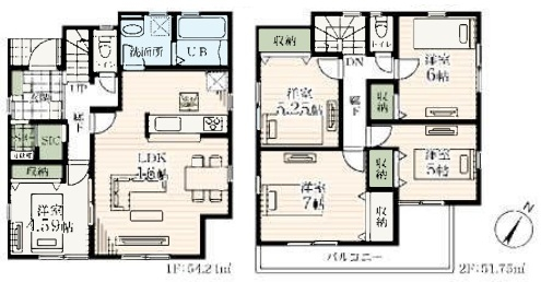 (1階)LDK16.0、(1階)洋4.59、(2階)洋7.0、(2階)洋6.0、(2階)洋5.25、(2階)洋5.0 |