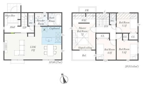 (1階)LDK19.0、(2階)洋7.0、(2階)洋5.8、(2階)洋5.3、(2階)洋4.8 |